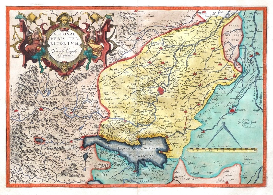 V. d. Broecke Nr. 120; Koeman III, map 7111:31, ed. 31:041 (1592 Latin). - A decorative map of the Province of Verona with Lake Garda (Lago de Garda) at the bottom. Oriented to the east.
