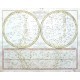 A double-hemisphere map depicting the stars and constellations of the Northern and Southern Hemisphere. Below is a tabular view, showing the constellations and paths of the planets centered on equator. - Old fold of paper (before printing) left of the center. Some water stains at the top (outside of the printed area).