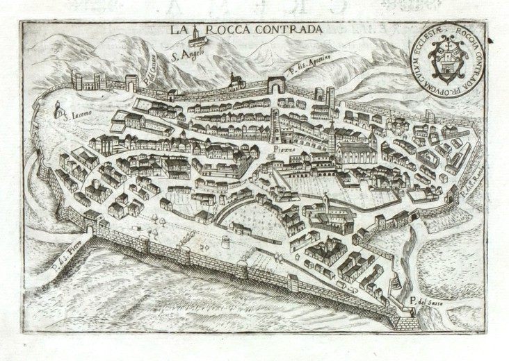 Arcevia. "La Rocca Contrada". Orig. copperplate engraving, Pietro Bertelli, "Theatrum Urbium Italicarum", Venice, 1599. With engraved title and a coat-of-arms. 12,5:18 cm.