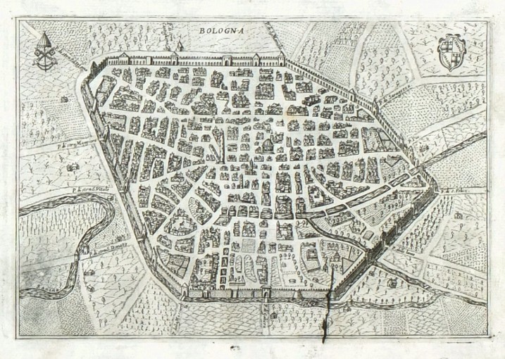 Bologna. "Bologna". Orig. copperplate engraving, Pietro Bertelli, "Theatrum Urbium Italicarum", Venice, 1599. With 2 small coats-of-arms. 12:18 cm.