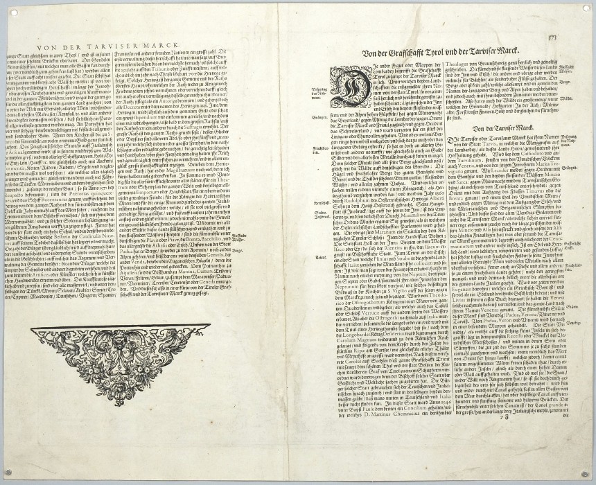 Lombardei, Venetien und Tirol (Trentino-Südtirol). "Tarvisina Marchia et Tirolis Comitatus". Orig. copperplate engraving, G. Mercator, Duisburg, 1589. Published by J. Janssonius and H. Hondius in Amsterdam, 1633. With ornamental title-cartouche. 35,5:43,5 cm printed on paper sized 41,5:51 cm.