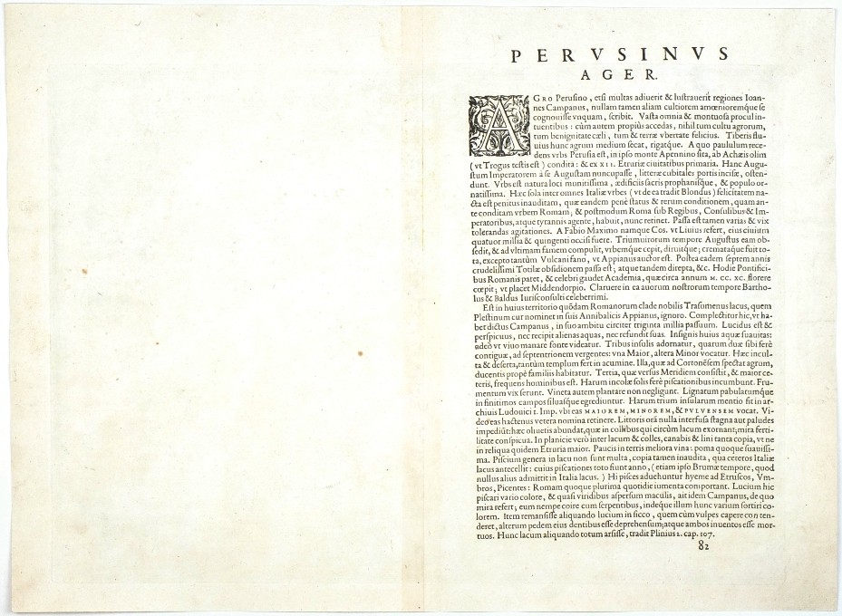 Koeman III, map 7340:31, ed. 31:051 (1595 Latin); V. d. Broecke 136. - Dekorativer Karte von der Provinz Perugia im Mittelitalien. Mit der Hauptstadt Perugia in der Mitte und dem Trasimenische See (Lago Trasimeno) links. - Gedruckt auf dem Papier im Format 48:58 cm.