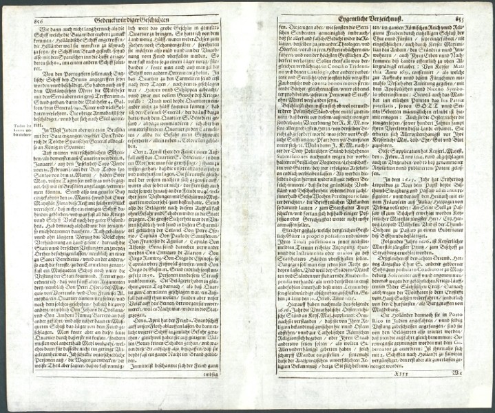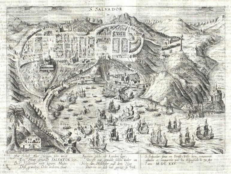 Die Rückeroberung Bahias war eine spanisch-portugiesische Militärexpedition im Jahr 1625 zur Rückeroberung der Stadt Bahia (heute Salvador) in Brasilien von den Truppen der niederländischen Westindien-Kompanie. - Gedruckt auf dünnem Papier - der Text aus der Rückseite schimmert durch.