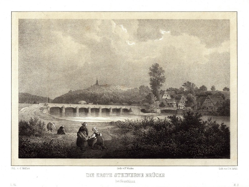 Dolní Olešnice - Nové Zámky. "Die erste steinerne Brücke bei Neuschloss". Pův. tónovaná litografie. Podle C. Müllerovy kresby litografoval C. W. Arldt. Z: C. G. Semmler - 'Der Elbstrom, von seinem Ursprunge bis zu seiner Mündung in die Nordsee ...'. Drážďany: Semmler, 1845. S figurami v popředí. 19:24,5 cm.