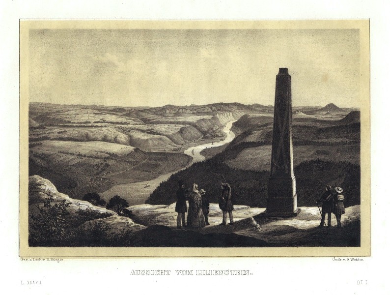 Sächsische Schweiz. "Aussicht vom Lilienstein". Orig. getönte Lithografie mit Unterdruck von R. Bürger. Aus: C. G. Semmler - 'Der Elbstrom, von seinem Ursprunge bis zu seiner Mündung in die Nordsee ...'. Dresden: Semmler, 1845. Mit zahlr. Figuren und dem Obelisk vorne. 16,5:24 cm.