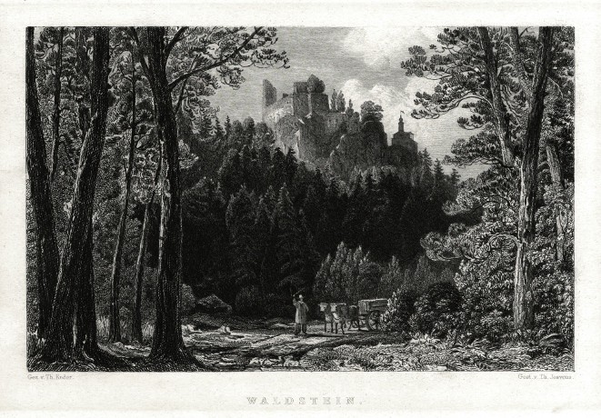 Valdštejn (u Turnova). "Waldstein". Původní ocelorytina, 1839. Podle T. Enderovy kresby ryl T. Jeavons. Vyd. Hartleben v Budapešti. S figurami v popředí a něm. titulem pod obrázkem. 10:15,5 cm (obrázek).