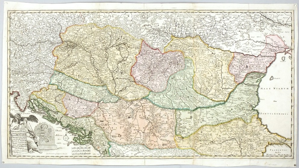 Donau, Südosteuropa. "Novissima et Accuratissima Totius Regni Hungariae, Dalmatiae, Croatiae, Sclavoniae, Bosniae, Serviae, Transylvaniae cum adiacentib. Regnis et Provinciis Tabula". Orig., alkol. Kupferstich Karte, J. von Sandrart, ca. 1690. Mit fig. Titelkart. mit Wappen. 41,5:79,5 cm.