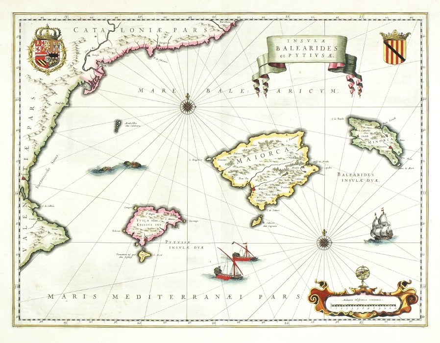 Balearischen Inseln (Balearen). "Insulae Balearides et Pytiusae". Orig. altkol. Kupferstich Karte, W. J. Blaeu, Amsterdam, 1634. Mit dekorativer Titelkart., ornament. Kart. mit Meilenzeiger, 2 Wappen, Windrose, Schiffe und Seeungeheuer. 38:50 cm auf dem Papier mit breiten Ränder im Format 50,5:59 cm.