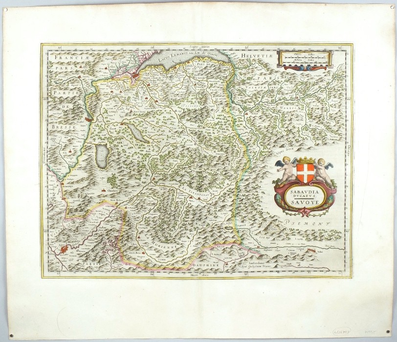 Savoyen. "Sabaudia ducatus. Savoye". Orig. altkol. Kupferstich Karte, W. J. Blaeu, 1631. Bei J. Blaeu in Amsterdam, 1644. Mit ornament. Titelkart. mit von Putti gehaltenen Wappen und ornament. Kart. mit Meilenzeiger. 38:50 cm auf dem Papier im Format 54:61,5 cm.