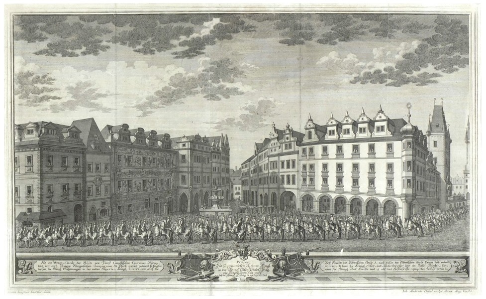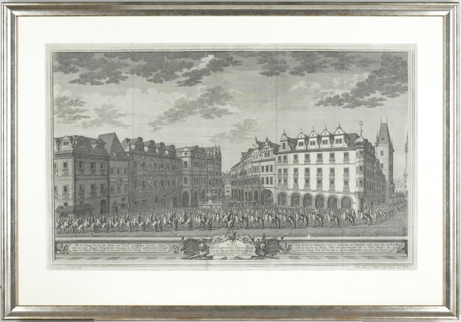 Praha. Malé náměstí. Korunovace Marie Terezie. "Prospect Des so genandten Kleinen Ringl in der Königl. Alten Stadt Prag ... de 29 April 1743". Původní mědirytina z J. J. Ramhofského 'Trojí popsání předně slavnýho vjezdu … Mariae Theresiae … do královských Měst pražských', K. F. Rosenmüller, 1743. Podle J. J. Dietzlerovy kresby ryl J. A. Pfeffel. Pohled na Malé náměstí s korunovačním průvodem Marie Terezie. S ornamentální titulní kartuší v dekorativní liště s popisem dole. 36:61 cm.