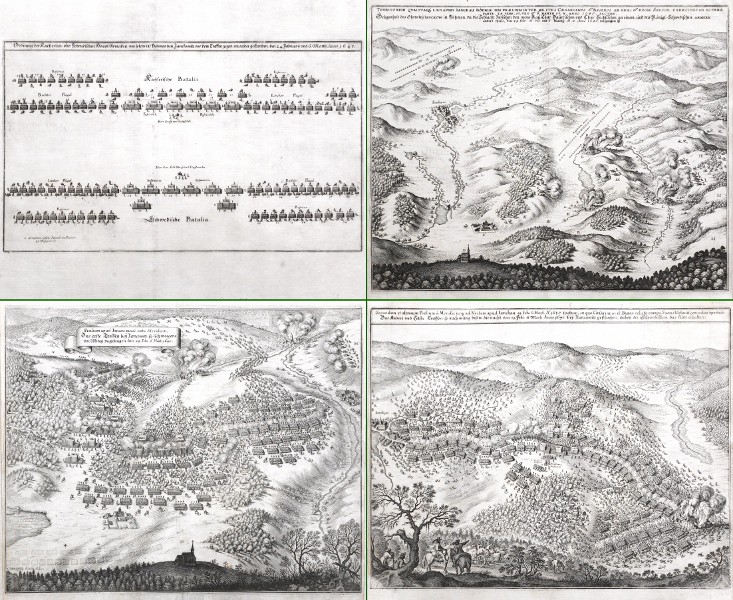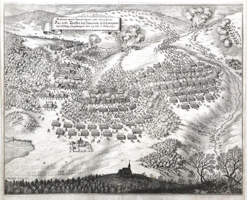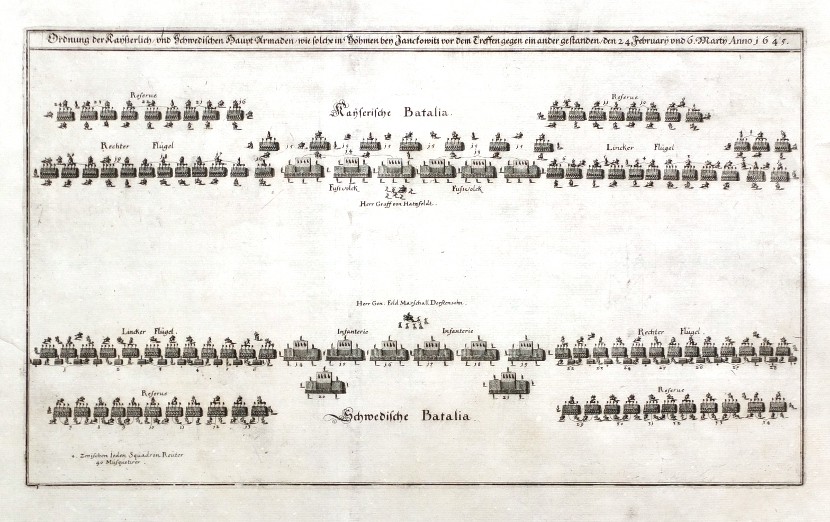Bitva u Jankova. "Ordnung der ... Armaden... - Territorium Qualitasq ... - Praelium apud Iancou ... -Secundum et ultimum Praelium ... apud Ianckau ... - ". Původní mědirytina, M. Merian, 1663. 4 listy.