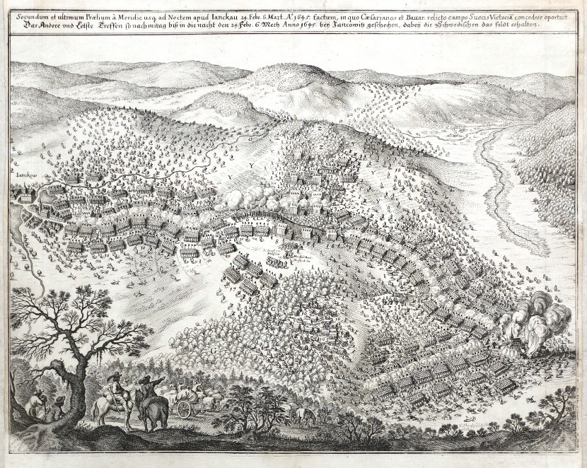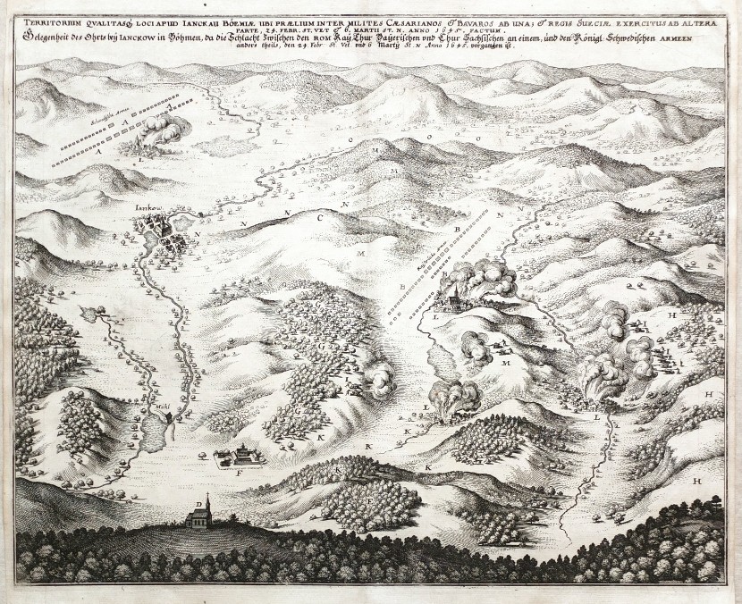 Bitva u Jankova. "Ordnung der Kaijsserlich, und Schwedischen Haupt Armaden, wie solche in Böhmen beij Jankowitz vor dem Treffen gegen ein ander gestanden, den 24 Februarij und 6. Martij Anno 1645". - "Territorium Qualitasq loci apud Ianckau Böemiae ... Gelegenheit des Ohrts beij Ianckow in Böhmen, da die Schlacht Zwischen den Rom Kaij, Chur Baijerischen und Chur Sachsischen an einem, und den Königl: Schwedischen Armeen anders theils, den 24. Febr: St. Vet. und 6. Martij St. n Anno 1645. vorgangen ist". - "Praelium apud Iancou ... Das erste Treffen beij Jancowitz, so sich morgens vor Mittag zu getragen den 24 Febr. 6 Mart, 1645". - "Secundum et ultimum Praelium ... apud Ianckau ... Das Andere und Letste Treffen so nach mitag biss in die nacht den 24. Febr. 6. Mertz Anno 1645. beij Jancowitz geschechen, dabei die Schwedischen das feldt erhalten". Původní mědirytiny, M. Merian, Theatrum Europaeum, 1663. S titulními kartušemi (tituly v záhlaví). 4 listy, každý ca. 30:38 cm, resp. 22,5:38 cm (Ordnung ...).