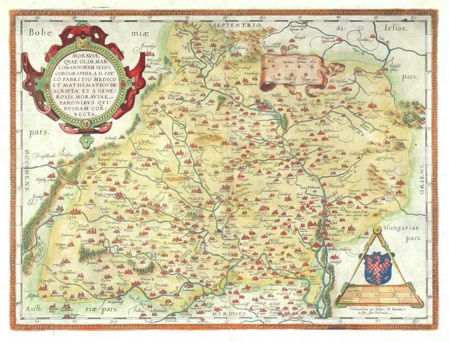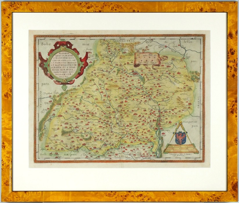 Morava. "Moraviae, quae olim Marcomannorum Sedes, corographia". Původní, staře kolorovaná mědirytina podle P. Fabritiovy mapy Moravy. A. Ortelius, Antverpy, 1572. S velkou ornamentální titulní kartuší, další kartuší s vysvětlivkami a dekorativním měřítkem mapy s kartografickým kružítkem a moravským erbem. 35,5:47,5 cm.