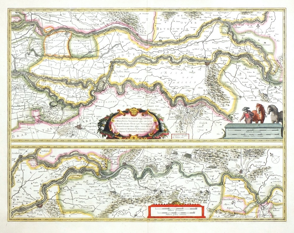 Koeman II, map 3705:2, ed. 2:101 (1635 Latin). - Dekorative Karte des Rheinverlaufs von Rhinberg bis Gorinchem und den Zusammenflüssen mit Maas und Waal.
