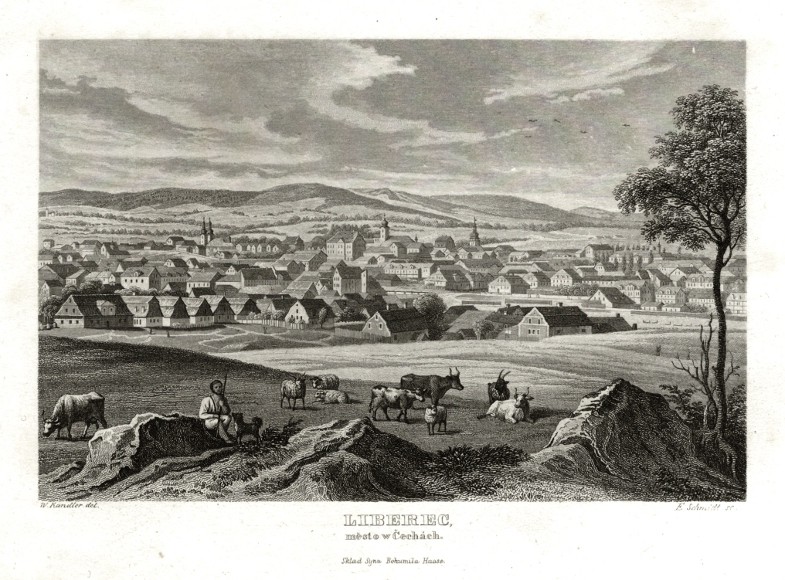 Liberec. "Liberec město w Čechách". Původní ocelorytina. Podle W. Kandlerovy kresby ryl E. Schmidt. Vyd. Synové B. Haase v Praze, ca. 1830. S pasákem krav v popředí a rytým titulem pod obrázkem. 10:15,5 cm (obrázek) na papíře o rozměrech 19,5:27 cm.