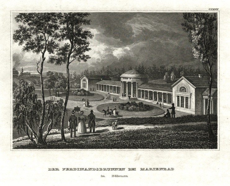 Mariánské Lázně. Ferdinadův pramen. "Der Ferdinandsbrunnen bei Marienbad". Původní ocelorytina, Meyer's Universum, ca. 1840. S figurami v popředí a německým titulem pod obrázkem. 10:14,5 cm (obrázek) na papíře o rozměrech 17,5:25,5 cm.