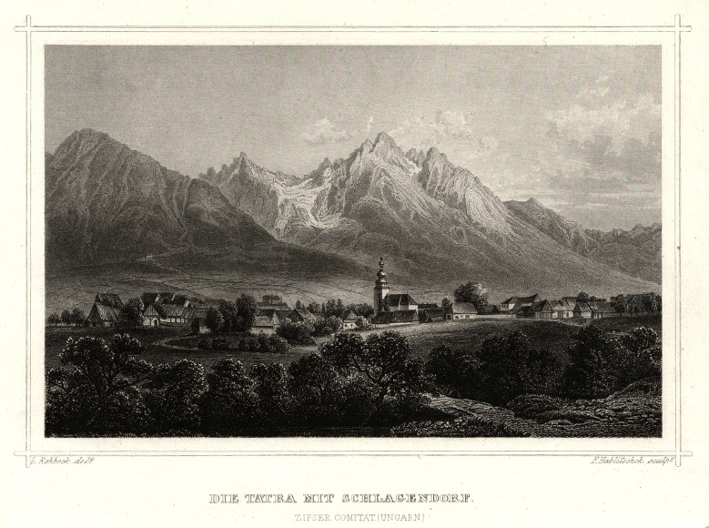 Veľký Slavkov, Tatry. "Die Tatra mit Schlagendorf. Zipser Comitat (Ungarn)". Původní ocelorytina. Podle L. Rohbockovy kresby ryl F. Hablitschek. Vyd. G. G. Lange v Darmstadtu, 1860. S německým titulem pod obrázkem. 12,5:18,5 cm (obrázek) na papíře o rozměrech 15,5:23,5 cm.