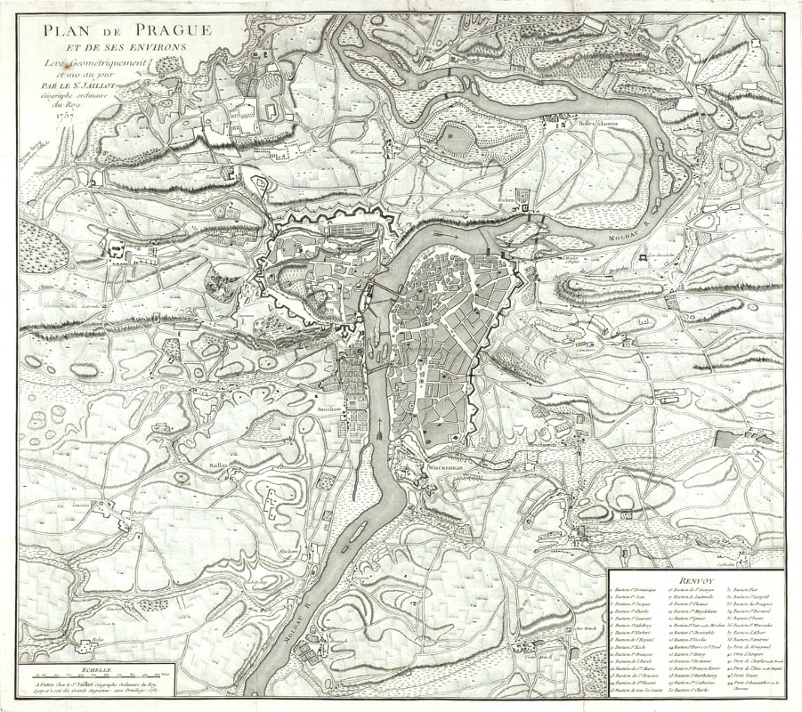Praha a okolí. "Plan de Prague et de ses environs, levé géométriquement et mis au jour par le Sr Jaillot". Původní mědirytina, Jaillot, Paříž, 1757. S rytým titulem, kartuší s vysvětlivkami ('Renvoy') a kartuší s adresou vydavatele. 53:59 cm.