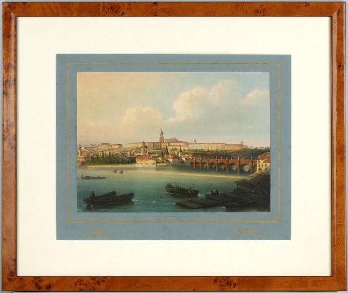 Nebehay-Wagner 261/47. - Pohled na Malou Stranu, Hradčany a Karlův most. Z nejluxusnější verze 'Malerisch-historisches Album von Königreich Böhmen' - kolorované litografie jsou montovány na nakladatelské modro-šedé kartony se zlacenými nápisy. - Cena s paspartou a kořenicovým rámem (39,5:47 cm).