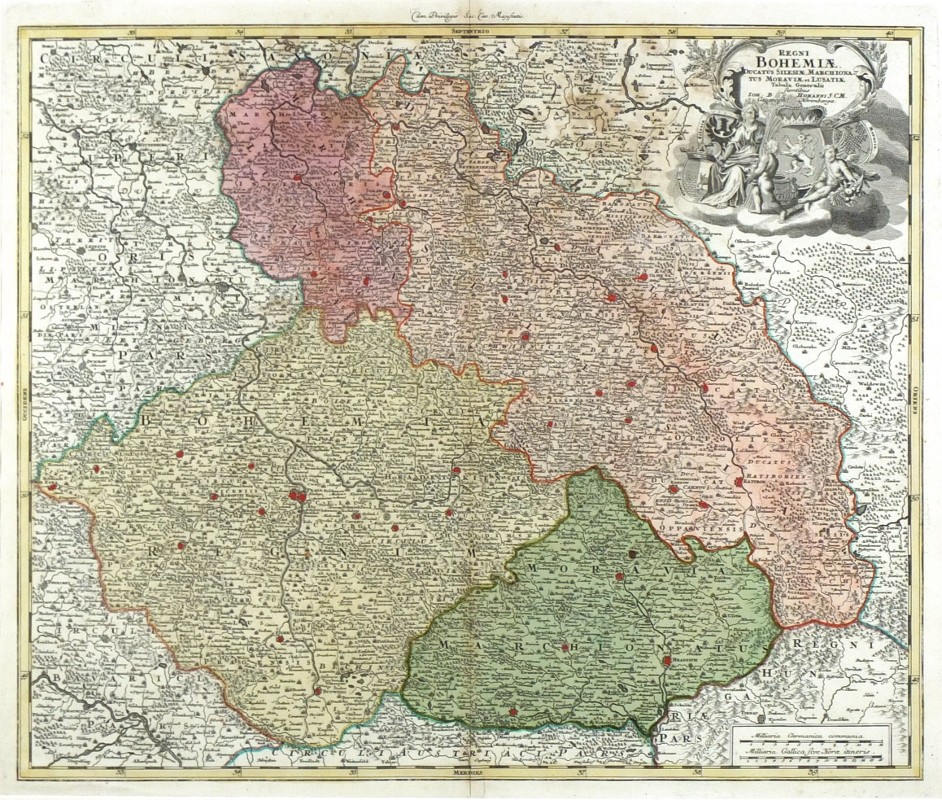 Čechy, Morava, Slezsko a Lužice. "Regni Bohemiae, Ducatus Silesiae, Marchionatus Moraviae et Lusatiae Tabula Generalis". Původní, staře kolorovaný mědirytina, J. B. Homann, Norimberk, ca. 1715. S figurální titulní kartuší se 4 erby (českým, moravským, slezským a lužickým) a kartuší s měřítkem mapy "Milliaria Germanica ... Gallica ...". 47,5:56,5 cm.