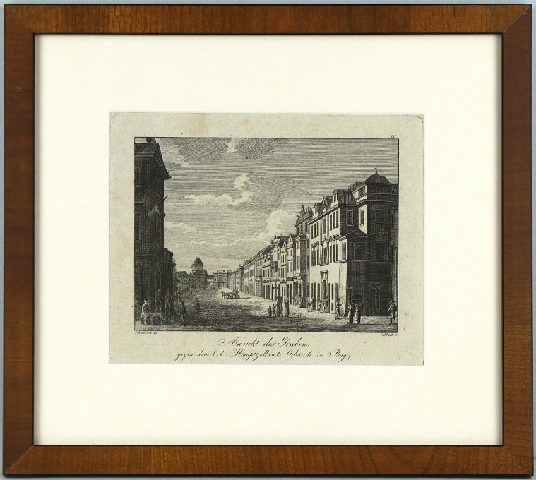 Pluth, Kašpar - Šembera, Josef. Praha, Na Příkopě. "Ansicht des Grabens gegen dem k:k Hauptzollamts Gebäude in Prag". Pův. mědirytina. Podle J. Šemberovy kresby ryl K. Pluth. Praha, Hyllos, ca. 1820. 15:17,5 cm.