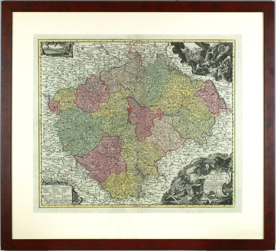 Čechy. "Mappa Geographica Totius Regni Bohemiae in XII Circulos divisae, annexis Comitatu Glacensi et Districtu Egerano ...". Pův., staře kol. mědirytirytina. Tzv. "malá" Müllerova mapa Čech. Vyd. T. C. Lotter v Augsburku, (1750).