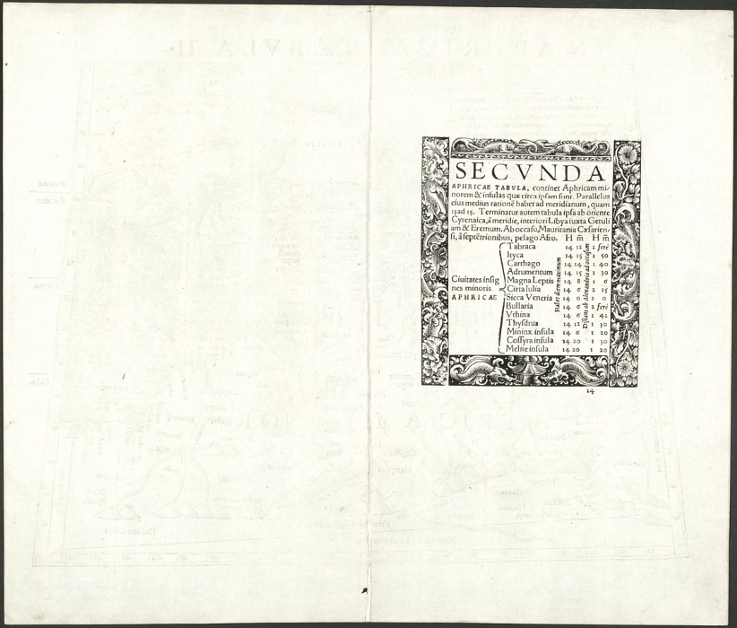 Nordafrika. "Aphricae Tabula II". Original woodblock from the first edition of S. Münster's Geographia. Published by Heinrch Petri (Heinrich Petri) in Basel, 1540. With latin title above the map, a cartouche and a depiction of the Apostle Paul's shipwreck near Malta. 25,5:33,5 cm.