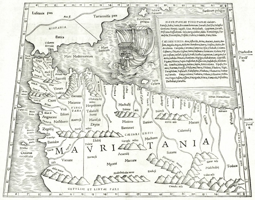 Nordafrika. "Aphricae Tabula I". Orig. woodblock from the first edition of S. Münster's Geographia. Published by Heinrch Petri in Basel, 1540. With latin title above the map, a cartouche and depiction of a ship. 25,5:33 cm.