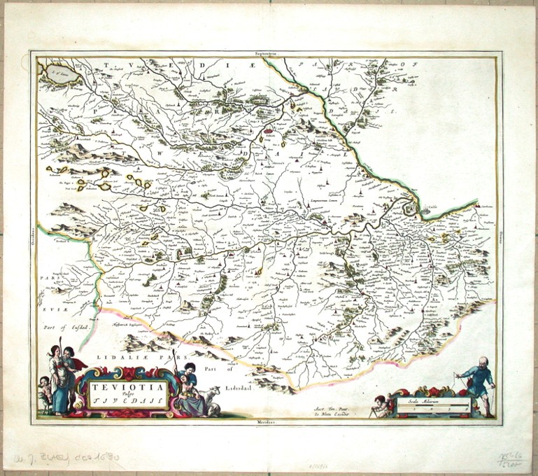 Schottland. Scottish Borders. Teviotdale. "Teviotia Vulgo Tivedail". Orig. copperplate engraving after T. Pont's map. Published by J. Blaeu in Amsterdam, 1654. Original old colouring. With ornametal and figure title-cartouche and another figure cartouche with the scale of map. 43:54 cm.