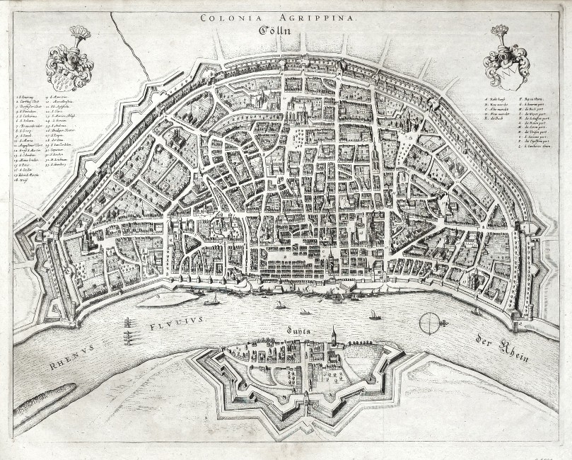 Köln. "Colonia Agrippina. Cölln". Orig. Kupferstich, J. Janssonius aus G. Leti "Ritratti historici ...", Amsterdam, 1689. Mit gest. lat.-dt. Titel, 2 Wappen und Erklärungen (1.-33., A.-Q.). 39,5:50,5 cm.