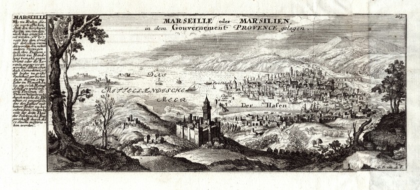 Marseille. "Marseille oder Marsilien, in dem Gouvernement Provence gelegen". Orig. Kupferstich von G. Bodenehr, 1720. Mit gest. Titel und begleitendem Text links. 14,5:35,5 cm.