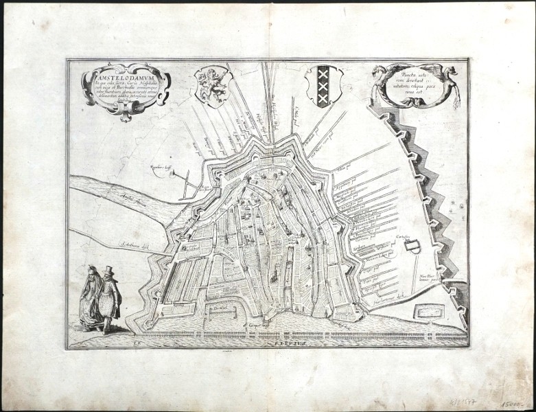 Amsterdam. "Amstelodamum". Orig. copper-engraving from the 6th part of Latin ed. of Braun and Hogenberg's "Civitates Orbis Terrarum". Published by A. Hierat in Cologne, 1618. With ornamental title-cartouche, another ornamental cartouche, 2 coats-of-arms and 2 figures in the lower left corner. 28:39 cm (11 x 15 1/2 inch.).