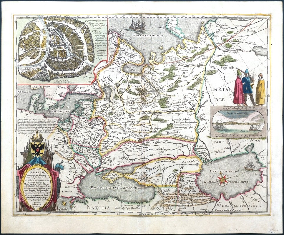 Russland. "Tabula Russiae ex autographo, quod delineandum curavit Foedor filius Tzaris Boris desumcta; et ad fluvios Dwinam, Zuchanam, aliaque loca, quantum ex tabulis et notitiis ad nos delatis fieri potint, amplificata: ac Magno Domino, Tzari, et Magno Duci Michaeli Foedrowits omnium Russorum, Autocratori Wolodimeriae, Moscoviae et Novogardiae, Tzari Cazaniae, Tzari Astracaniae, Tzari Sibieriae, Domino Plescoviae Magno Duci Smolenscoiae, Otweriae, Iugoriae, Permiae, Wiatkiae, Bulgariae etc: Item Domino et Magno Duci Novogardiae Inferioris etc: Domino regionum Iveriae Kartalinie et Groesiniae Tzari etc: dedicata ab Hesselo Gerardo". Orig. copperplate engraving, W. J. Blaeu, 1634, after H. Gerritsz' map of Russia from 1614. Published by J. and C. Blaeu in Amsterdam, 1640. Orig. old colouring. With decorative title-cartouche, inset plan of Moscow ("Moscua ad Architypum Foedori Borißowitsi"), a cartouche with a view of Arkhangelsk ("Archangelsckagoroda") with three figures, and a wind rose in Caspian Sea and two ships. 43:55 cm.