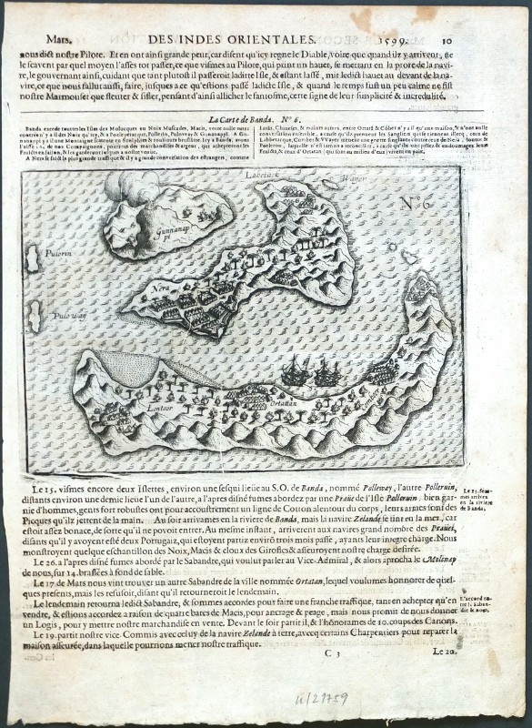 Banda-Inseln. "La Carte de Banda". Orig. copper-engraving from J. Cornelisz. van Neck's "Le second livre, Iournal ou Comptoir ... du Voiage ... 1598". Published by C. Clesz, Amsterdam for Bonaventure Dacivelle, Calais, 1601. With title above the map. 14:20 cm.