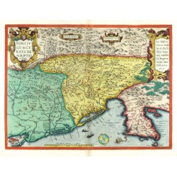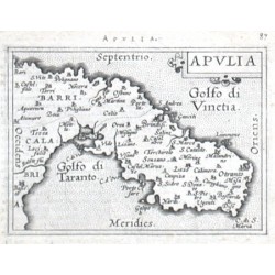 Apulien (Puglia). "Apulia". Orig. copper-engraving from the French edition of A. Ortelius' Epitome, published in Antwerp by Plantin Press for F. Galle, 1598. With ornamental title-cartouche and Latin title above the map. 8:11 cm.