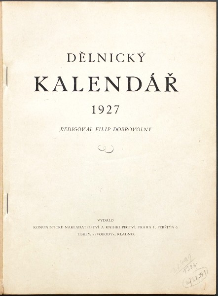 Dobrovolný, Filip (red.). "Dělnický kalendář 1927"; na obálce: "Komunistický kaledndář 1927". Praha: Komunistické nakladatelství a knihkupectví, (1926). 4°. 112, 16 ("Seznam trhů v Československé Republice na rok 1927"). S množstvím ilustrací, fotografií a dobových reklam. OIllBrož.