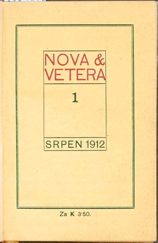 "Nova et vetera", čís. 1. Osvětimany: A. L. Stříž, srpen 1912. Tisk Kryl a Scotti v Novém Jičíně. 12°. Ca. 200 str. - každý příspěvek stránkován zvlášť. S několika obrázky v textu (1 kolorovaný) a třemi obrázky papežů. Dobová poloperg. vazba. Pův. obálka vevázána.
