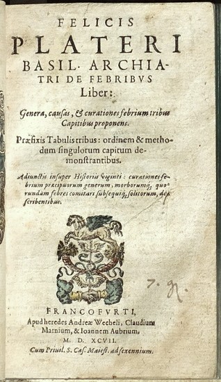 Medizin. Scribonius, Wilhelm Adolf (1550-1600). ("Idea Medicinae secundum logicas leges informandae et describendae. Cui accesit de inspectione urinarum; Item de hydrope; De podagra et dysentria, physiologa curiosa"). Basel: Waldkirch, 1585. (19), 93 (recte 95), (5) S. Holzschnitt-Verlägersmarke auf der letzte Seite. Gebunden mit: Platter, Felix (1536-1614). "Archiatri de Febribus Liber: Genera, causas, & curationes febrium tribus Capitibus proponens. Præfixis Tabulis tribus: ordinem & methodum singulorum capitum demonstrantibus". Frankfurt am Main: A. Wechel - Erben, 1597. (8), 354 S. Holzschnitt-Verlägersmarke auf dem Titel. Gebunden mit: Campolongo, Emilio (1550-1604). "Aemilii Campolongi ... Liber unus De arthritide ...". Speyer: B. Albini. 1592. (13), 111 S. Holzschnitt-Verlägersmarke auf dem Titel. Ohne den zweiten Titel gebunden (Antonii Sneebergeri Tigurini enumeratio medicamentorum facile parabilium aduersus omnis genetis articulorum dolores). Renaissance blindgeprägter Ledereinband mit erhaltenen Schliessen. Drei medizinische Schriften aus dem 16. Jhdt. in einem Band. - An vielen Stellen wird der Text mit einem Stift unterstrichen. Alte handschriftliche Notizen an den Seitenränder. - Dem ersten Buch (Scribonius) fehlt die Titelseite. Auf dem Titelblatt des dritten Buches (Campolongo) wurde der Name des ungebundenen zweiten Titels mit einem Stift durchgestrichen.