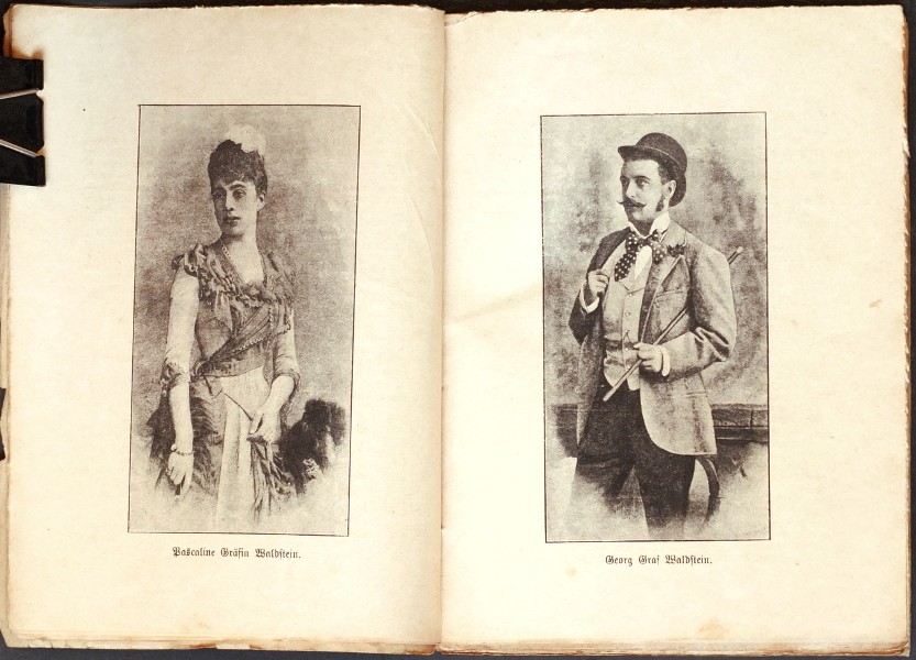 "Sensation=Proceß der Erben des Grafen Georg Waldstein. Ausführliche Beschreibung. Mit 7 Illustrationen". Prag: Hynek, (1892). 8vo. 64 S. OBrosch. mit Titlel und Waldsteins Porträt auf der Vorderseite des Umschlags.