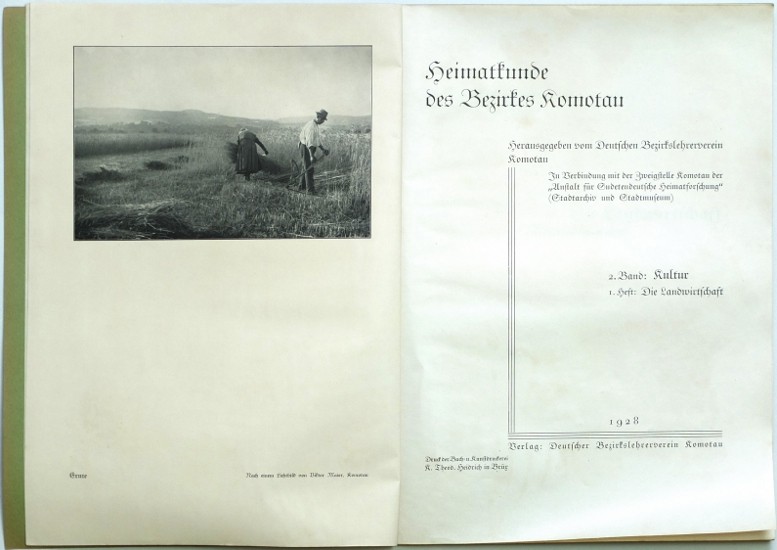 Chomutov. "Heimatkunde des Bezirkes Komotau. 2. Band: Kultur. 1. Heft: Dr. Alois Schlesinger - Die Landwirdschaft". Chomutov: Deutscher Bezirkslehrerverein Komotau, 1928. Fol. Il. frontispis (dobová fotografie), 52, (4) str. (dobové reklamy). S množstvím plánků a statistických tabulek. OBrož. s pův. il. obálkou.