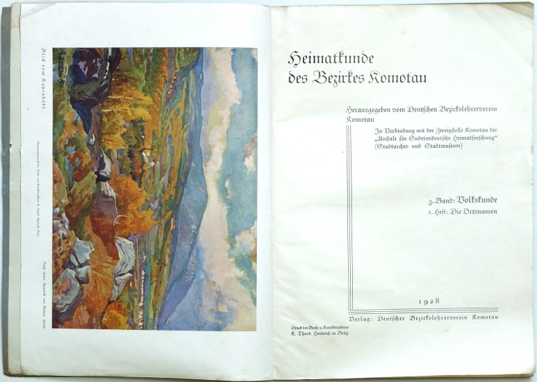 Chomutov. "Heimatkunde des Bezirkes Komotau. 3. Band: Volkskunde. 1. Heft: Dr. Karl Rösler - Die Ortsnamen". Chomutov: Deutscher Bezirkslehrerverein Komotau, 1928. Fol. Il. frontispis, 104, (4) str. (dobové reklamy). S několika fotografiemi. OBrož. s pův. il. obálkou.