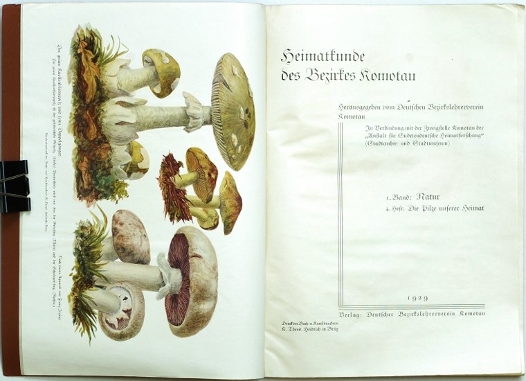Chomutov. "Heimatkunde des Bezirkes Komotau. 1. Band: Natur. 4. Heft: Franz Irzing - Die Pilze unserer Heimat". Chomutov: Deutscher Bezirkslehrerverein Komotau, 1929. Fol. Il. frontispis, 82, (4) str. (dobové reklamy). S množstvím vyobrazení. OBrož. s pův. il. obálkou.