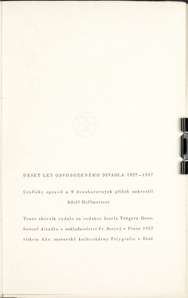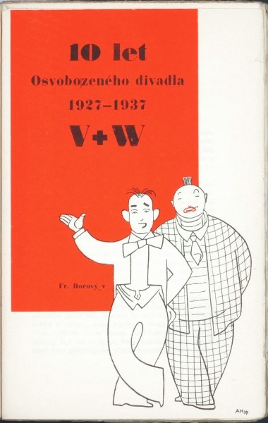 (Hoffmeister). "10 let Osvobozeného divadla V + W" (sborník). Praha: Borový, 1937. 8°. 177, (3) str. s množstvím fotografií. Obálka, úprava a 9 dvoubarvených příloh A. Hoffmeister. OIlBrož.