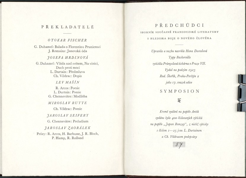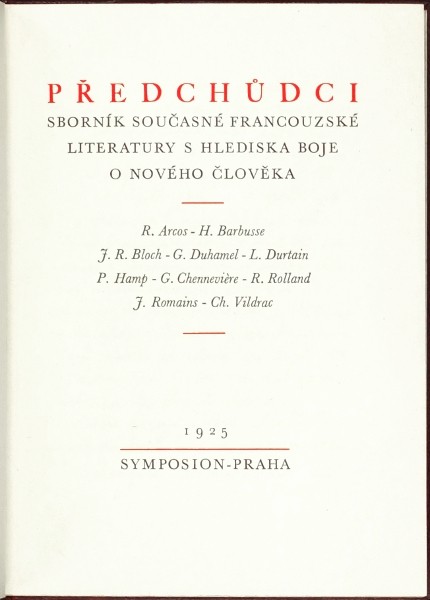 "Předchůdci. Sborník současné francouzské literatury s hlediska boje o nového člověka". (R. Arcos, H. Barbusse, J. R. Bloch, G. Duhamel, L. Durtain, P. Hamp, G. Chenneviere, R. Rolland, J. Romains, Ch. Vildrac). Praha: Škeřík, 1925. Ed. Symposion, sv. 17. 8°. 217 (5) str. Exempl. 57/400 na pap. Japan Banzay. Tlač. celokož. vazba se zlacením na hřbetu.
