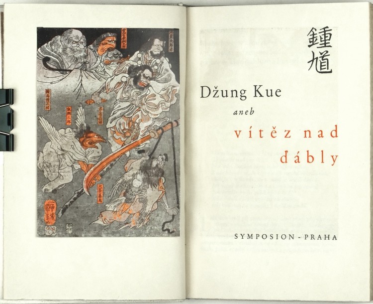 "Džung Kue aneb vítěz nad ďábly". Praha: R. Škeřík, 1938. Přel. P. Levit. Ed. Symposion, sv. 108. Přednostní výtisk čís. 8/200 na domácím Simili Japanu. 8°. 176, (3) str., frontispis, úprava a vazba podle čínských originálů. Orig. nakladatelská celokož. tlač. vazba.