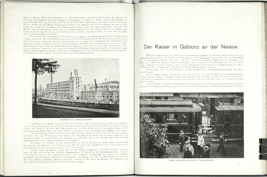 Do Liberce přijel císař František Josef I. v červnu 1906, aby zhlédl Výstavu českých Němců. Jeho návštěva Ginzkeyovy továrny ve Vratislavicích nedopadla dobře. Císař odmítl koberec se svým vytkaným portrétem se slovy, že po sobě nenechá nikoho šlapat. S tím padlo i povýšení I. Ginzkeye do šlechtického stavu. Na závěr návštěvy zavítal císař 24. června také do Jablonce, kde byl na hlavním náměstí, zvaném Staré tržiště, přijat reprezentací města. Navštívil kostel sv. Anny, Střelnici, uměleckoprůmyslovou školu a další instituce a sídla význačných podniků, např. firem Gebrüder Jägr a Gebrüder Mahla. Z Jablonce nad Nisou odjel do Rychnova, kde návštěvu ukončil. - Vazba v rozích a na hranách mírně odřená, uvnitř dobré.