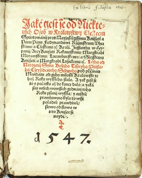 Knihopis čís. K00105. - Tendenční sbírka protistavovských nařízení Ferdinanda I. Habsburského a zemského sněmu vydaná po potlačení povstání českých stavů roku 1547. - Na předním přídeští nalepeno kolororované 'Ex libris F. Kafka', na prvních dvou listech za titulem rkp. exlibris a na poslední (nepotištěné) straně rukopisná poznámka téhož. - Vazba odřená, kožený potah ve hřbetu nahoře a dole a na zadních deskách potrhán, přezky a létající předsádky chybí. Titul a prvních 5 listů s dírkami od červotoče. Jinak dobře zachováno, kompletní.
