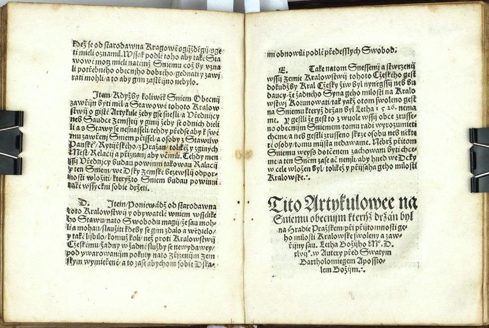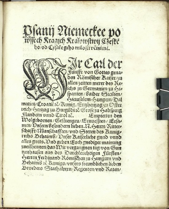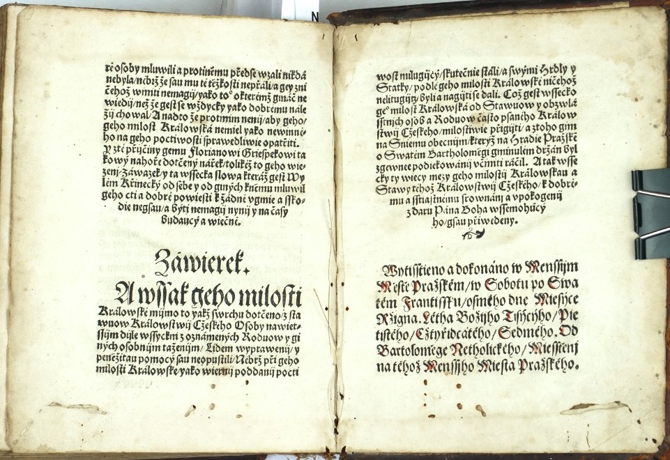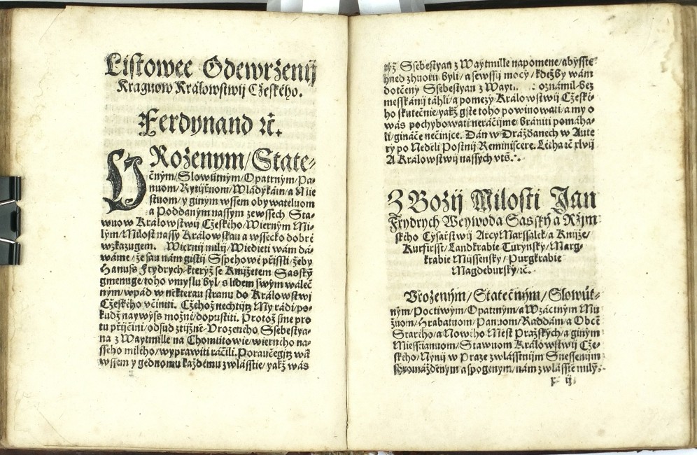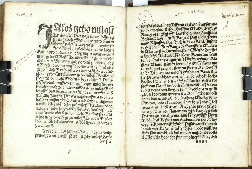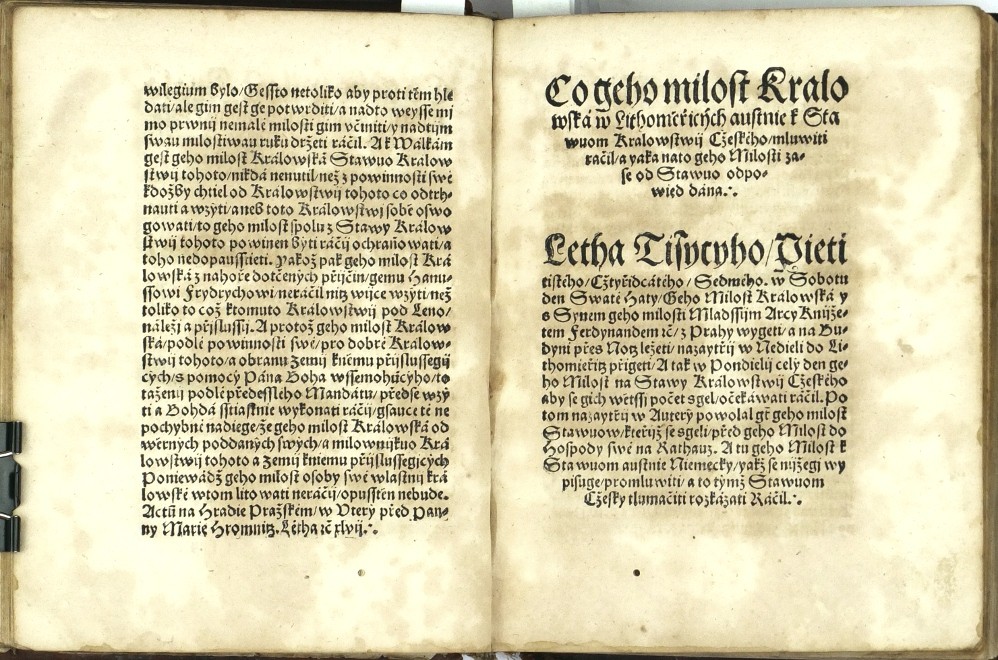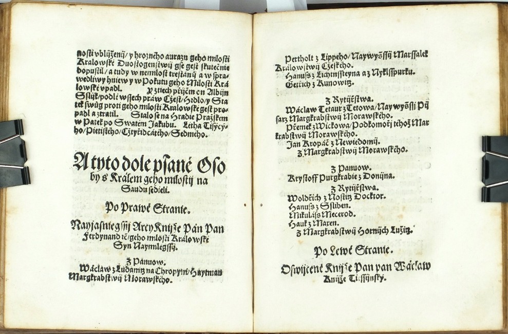(Ferdinand I. Habsburský). Netolický z Netolic, Bartoloměj (nakl.). "Akta tiech wssech wiecij které sau se mezy Nayjasniegssijm Knijžetem a Pánem Pánem Ferdynandem Ržijmským | Uherským | Cžeským ec | Králem ec. A niekterými Osobami z Stawuow Panského | Rytijřského | a Miestkého | Králowstwij Cžeského. Létha tohoto ec XLVII [= 1547]. zbiehly tuto Wytisstiené". Praha: Netolický z Netolic, 1547. 8°. (CCCLII) ll. Na titulu kolorovaný erb Království českého. Na listu (II.): "Jaké gest se od Niekterých Osob w Králowstwij Cžeskeem Spuntowánij proti Nayjasněgssýmu Knijžeti a Pánu Pánu Ferdynandowi Ržijmskému | Uherskému | a Cžeskému ec | Králi ... Létha od Narozenij Syna Božijho Tísýcýho | Pětistého | Cžtyřidcátého | Sedmého | pod přjčinau Mandátu od geho milosti Králowské téhož Roku wysslého | stalo. A yak gest se to s počátku až do konce dálo | a yaká sau wtěch wewssech gednánj toho Roku psanij wyssla | y austně promluweno bylo | to wsse pořádně prawdiwě | slowo od slowa w této Knijžce se nayde. 1547". Dobová celokožená vazba.