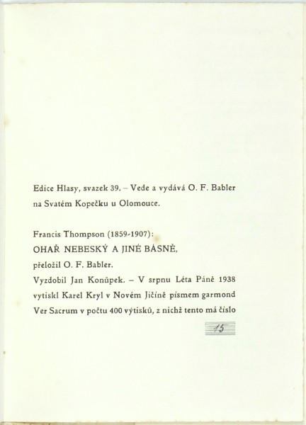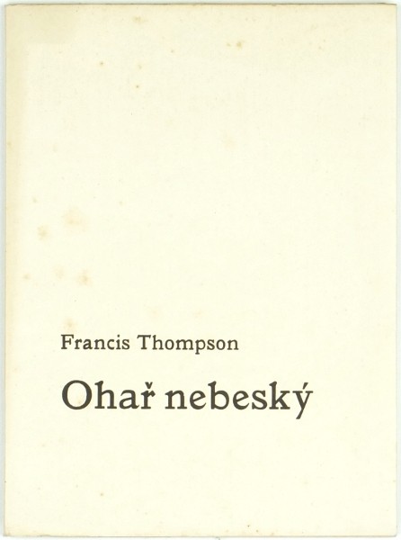 (Jan Konůpek). Thompson, Francis. "Ohař nebeský a jiné básně". Svatý Kopeček u Olomouce: Babler, 1938. Ed. 'Hlasy', sv. 39. Výtisk čís. 15/400. Kresba ve frontispisu J. Konůpek. 8°. 35, (4) str. OBrož.