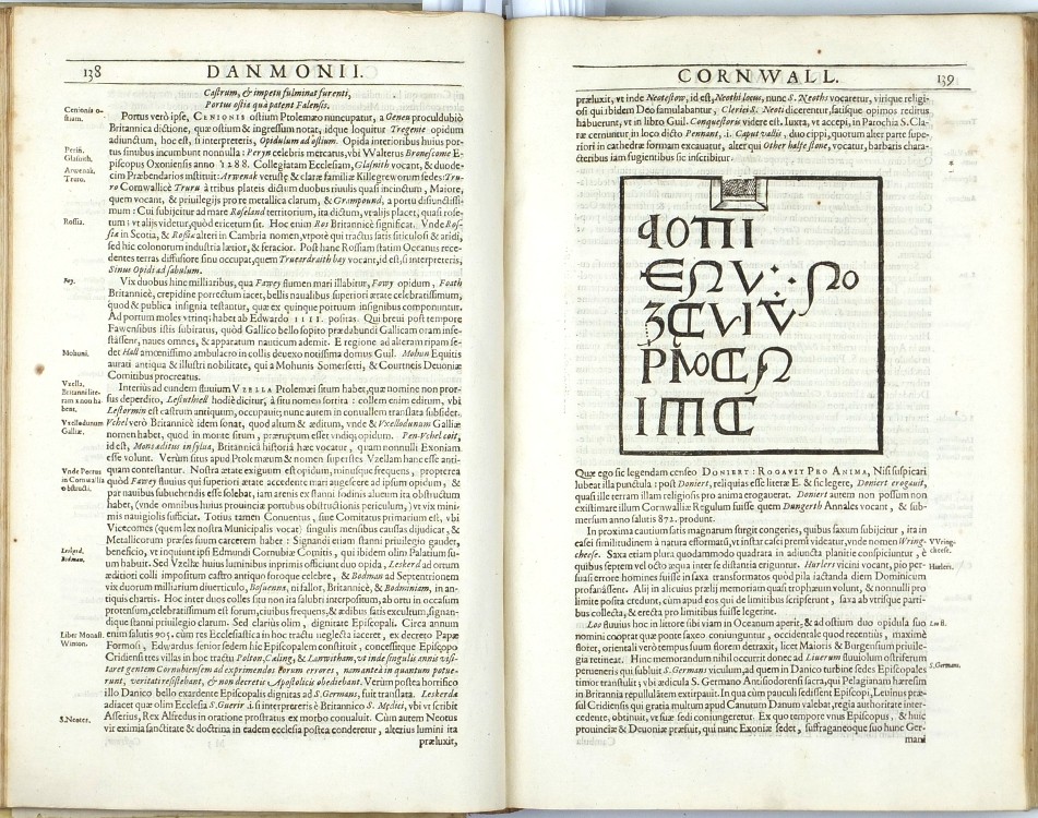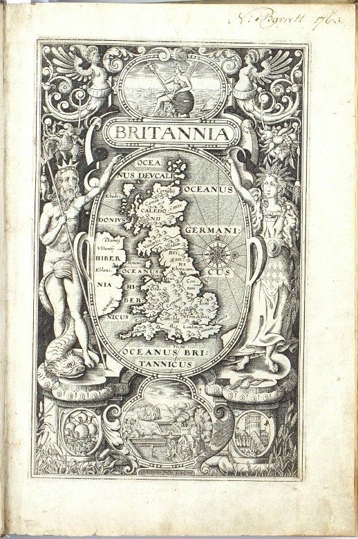 Camden, William. Britannia. First edition with county maps. "Britannia, sive Florentissimorum regnorum Angliae, Scotiae, Hiberniae et Insularum adjacentium ex intima antiquitate chorographica Descriptio: Nunc postremo recognita, plurimis locis magna acessione adauct, & Chartis chorographicis illustrata ...". London: George Bishop and John Norton, 1607. Folio. (16), 860, (24) pp. (with the usual irregularities in pagination) with full-page engraved title / frontispiece ('Britannia' - map of Great Britain in allegorical border), 57 engraved maps, 8 full-page engraved illustrations of coins (pp. 62-69), full-page engraving of Stonehenge (p. 183) and many woodcuts in the text (Roman inscriptions, the Rollright Stones, etc.). Full parchment binding from the time.